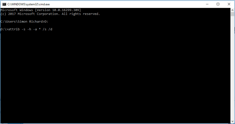 - Bước 3: Gõ lệnh “attrib -s -h -a * /s /d” trong đó: