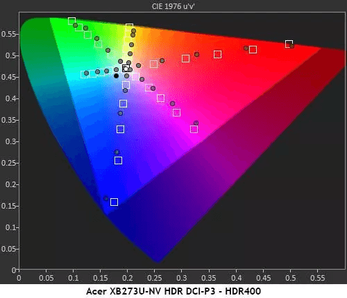 Chế độ Standard, Predator XB273U NV cho thấy chỉ số màu đo rất gần và tương đối chuẩn. Nó sử dụng gam màu DCI-P3 áp dụng cho cả SDR và HDR (trừ khi người dùng chọn dải không gian màu khác trong OSD). Chế độ sRGB hiển thị rất chính xác cùng với thanh trượt điều chỉnh độ sáng.