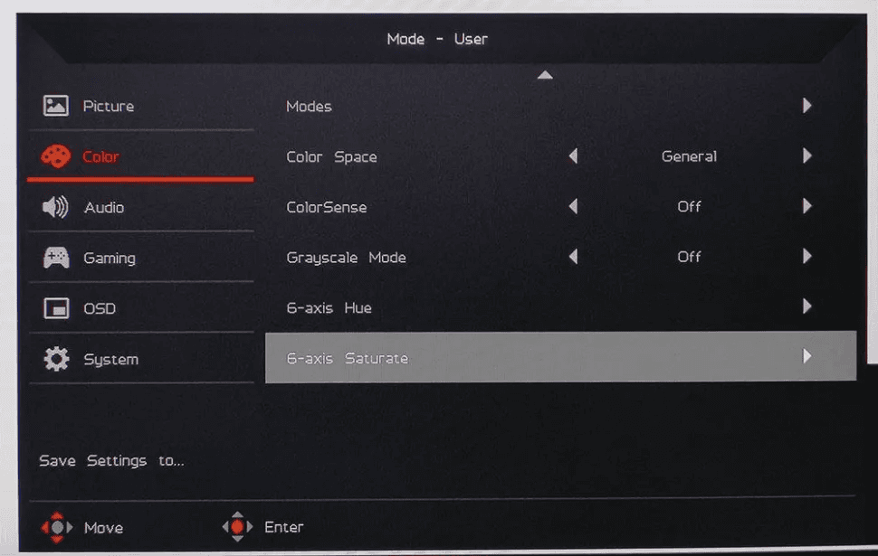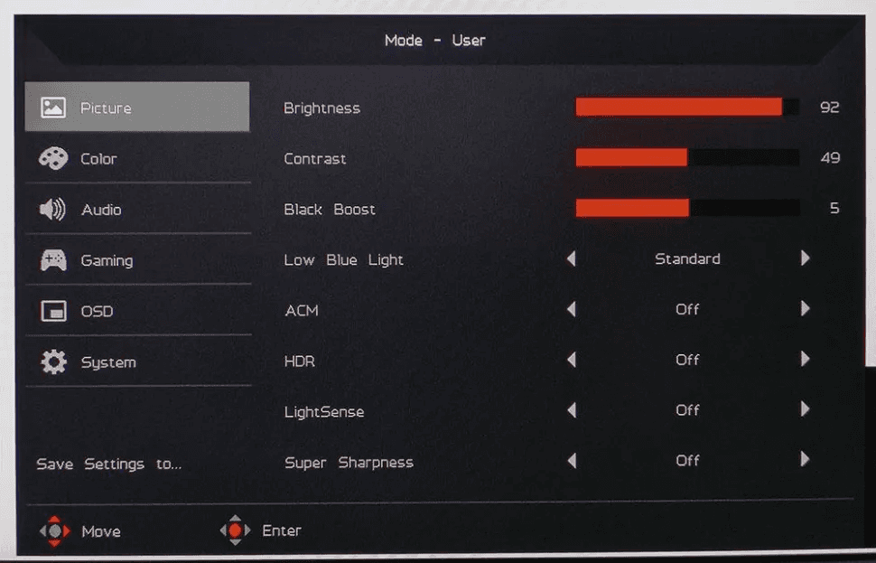Phần Picture có thể chỉnh được kha khá thành phần. Chúng bao gồm độ sáng, chế độ ánh sáng xanh dương thấp, ACM (tương phản tự động), HDR, LightSense và Super Sharpness (Siêu sắc nét). Người dùng có thể đặt HDR thành tự động để nó tự chuyển đôi giữa các loại tín hiệu. Đặc biệt trong các tựa game, hình ảnh trở nên đẹp nhất với chỉ số HDR400. LightSense kích hoạt cảm biến ánh sáng trong phòng được gắn ở viền dưới, tự chỉnh độ sáng và nhiệt độ màu của hình ảnh để mắt không bị mỏi. Tính năng Super Sharpness tăng cường góc cạnh của hình ảnh.
