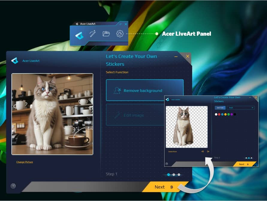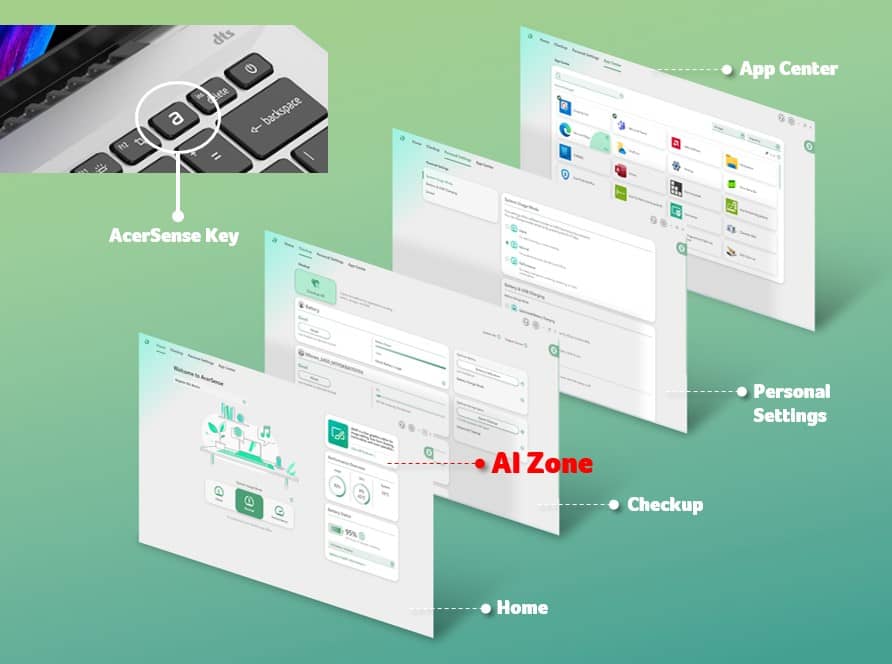Swift Go 14 đưa đến nhiều tính năng AI tuyệt vời với khu vực Acer AI Zone: Acer LiveArt (tách nền chỉ với một cú nhấp), AlterView (tạo hình nền động), GIMP và Intel Stable Diffusion (tự động tạo tác phẩm nghệ thuật qua câu lệnh). Ba ứng dụng AI tích hợp này khởi động nhanh chóng và dễ dàng thông qua AcerSense Key, bằng việc thao tác phím “A” trên bàn phím.