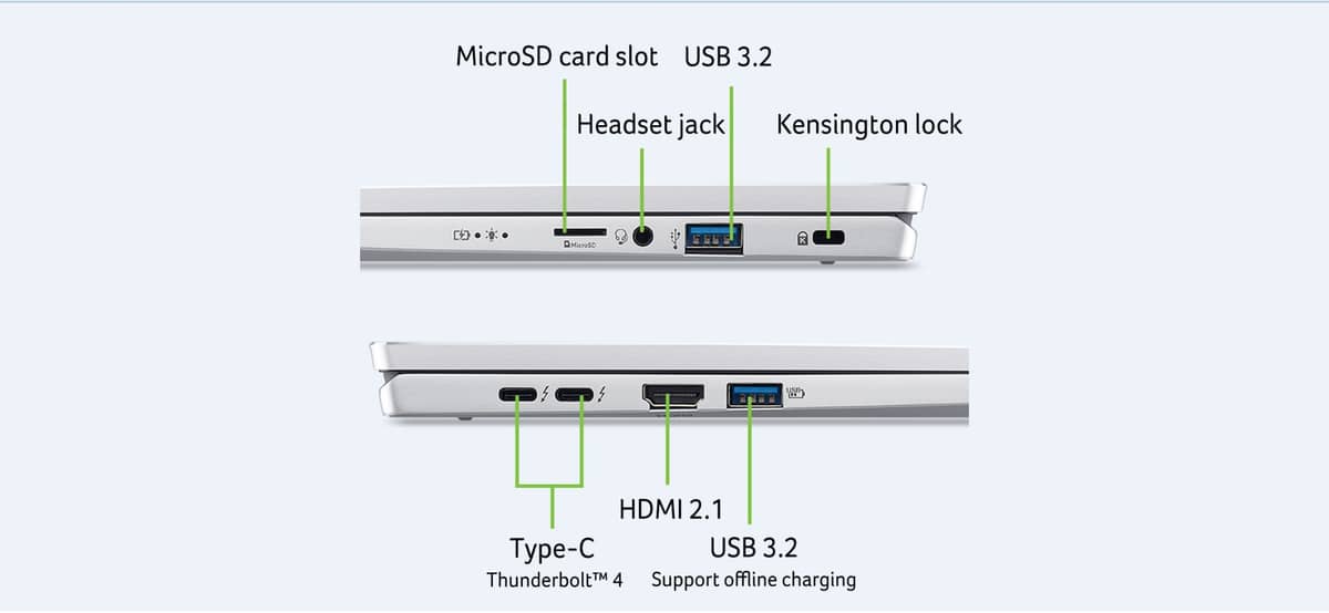 Swift Go 14 AI sở hữu hệ thống kết nối toàn diện với 2 cổng USB Type-C (Thunderbolt 4), HDMI 2.1, Wi-Fi 6E, Bluetooth LE Audio và khe cắm thẻ MicroSD. Nhờ vậy, bạn có thể dễ dàng kết nối với mọi thiết bị, truyền dữ liệu tốc độ cao và duy trì năng suất làm việc hiệu quả.