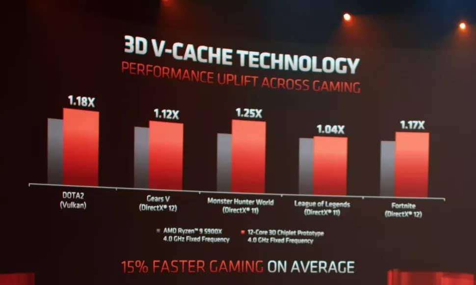 Để đưa tới kết luận cho người tiêu dùng ,Lisa Su đã đưa ra nhiều lựa chọn về điểm chuẩn trò chơi cho thấy Ryzen 9 5900X với công nghệ 3D V-Cache cung cấp hiệu suất trung bình cao hơn 15% trên nhiều trò chơi ở 1080p. Điều đó bao gồm các tựa game như Dota 2, Monster Hunter World, League of Legends và Fortnite.