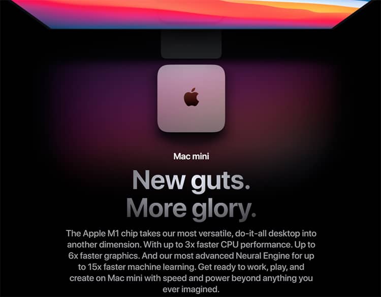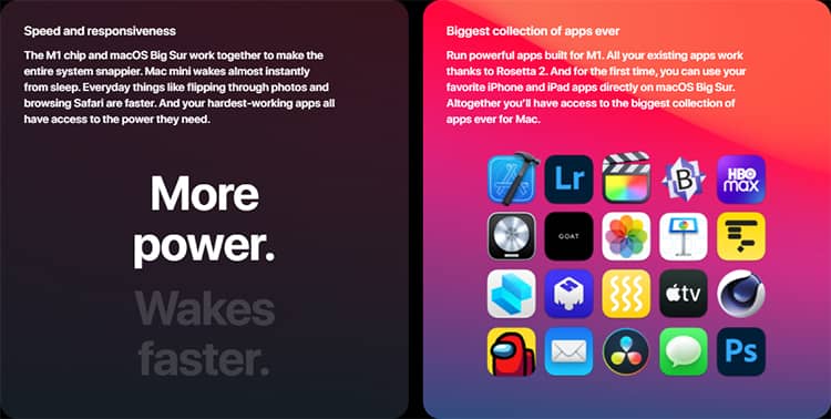 Với M1 sử dụng kiến trúc bộ nhớ hợp nhất giúp tận dụng băng thông tốc độ cao từ RAM và CPU hiệu quả. Nhờ vậy cho khả năng xử lý video nhanh hơn đến 3,9 lần và 7,1 lần cho xử lý hình ảnh trên chiếc Mac Mini này.