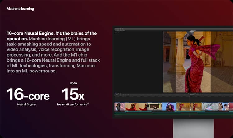 Vi xử lý M1 còn mang đến 16 nhân Neural Engine và đầy đủ các công nghệ máy học tiên tiến cho khả năng xử lý các tác vụ về tính toán, phân tích video, nhận dạng giọng nói, và nhiều hơn nữa.