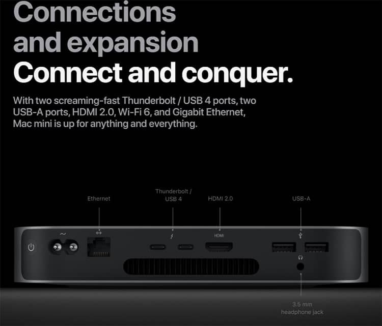 Là chiếc mac mini với hiệu năng mạnh mẽ, thì đi kèm nó là tích hợp cổng kết nối hiện đại nhất. Với 2 cổng Thunderbolt / USB thế hệ thứ 4 cho phép người dùng truyền dữ liệu tốc độ siêu cao lên đến 40GB/s/. Cùng với đó, người dùng có thể gắn thêm màn hình với độ phân giải lên đến 6K siêu sắc nét và mượt mà nhờ cổng kết nối HDMI 2.0 mới nhất với mac mini 2020 này.