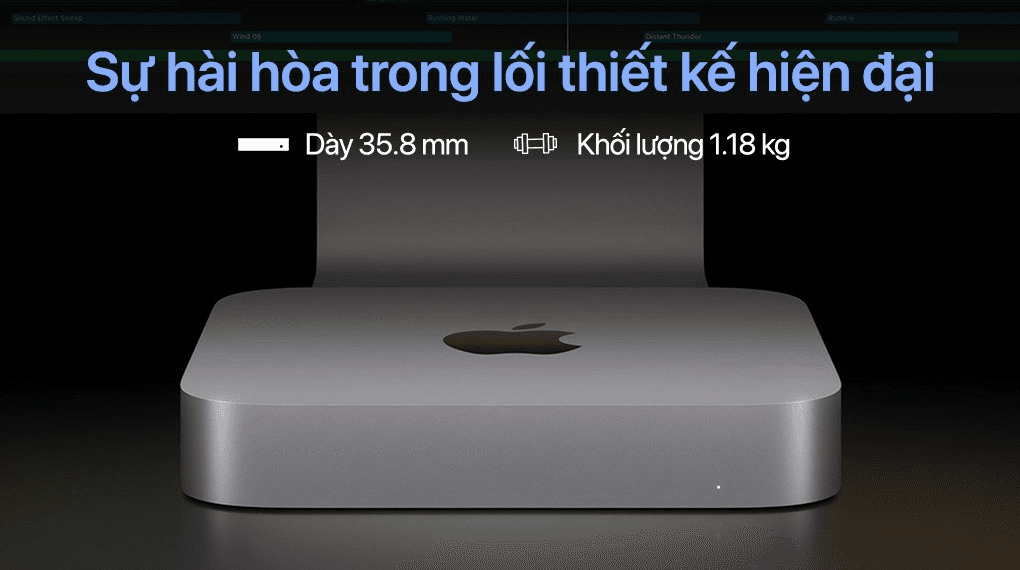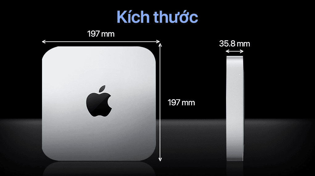 Mac Mini có thiết kế nhỏ gọn với kích thước chỉ 197 mm2 vuông và độ dày 35.8mm, giúp tiết kiệm không gian làm việc.