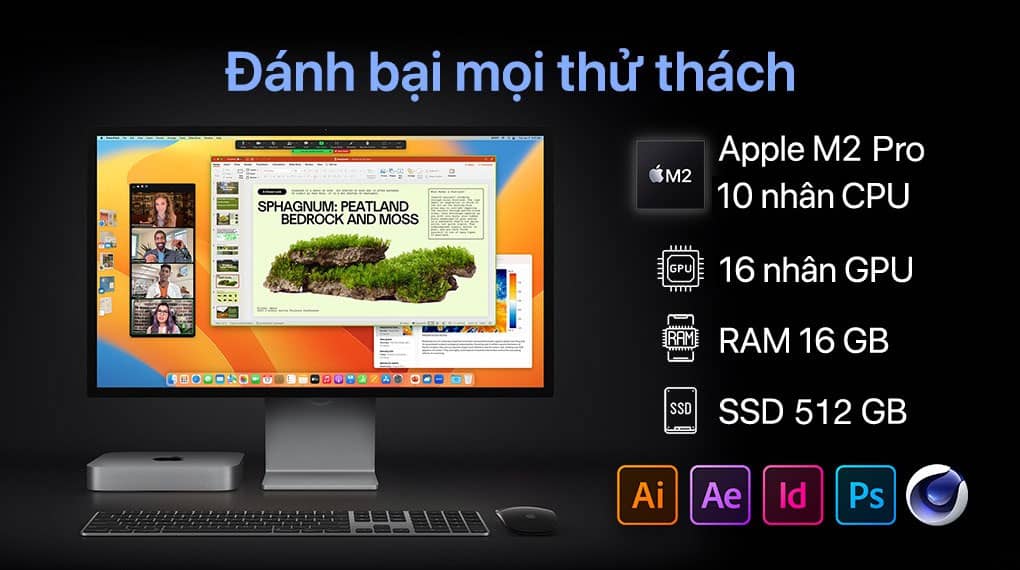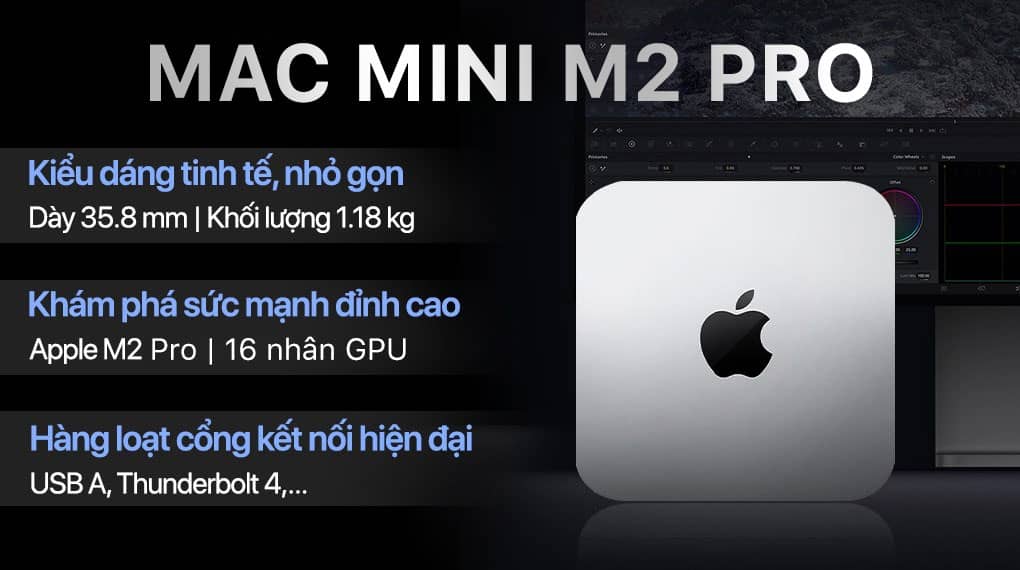 Mac Mini được trang bị chip Apple M2 Pro, với CPU 10 nhân và GPU 16 nhân. Xung nhịp cao và số nhân luồng lớn giúp Mac Mini xử lý mượt mà các tác vụ từ văn phòng đến đồ họa chuyên nghiệp. Card đồ họa tích hợp mạnh mẽ giúp Mac Mini đáp ứng tốt các phần mềm như Adobe Creative Cloud, Final Cut Pro và các ứng dụng văn phòng như Microsoft Office.