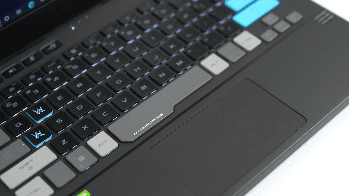 So với model Zephyrus G14 tiêu chuẩn chỉ có một màu đồng nhất với máy là đen hoặc trắng, bàn phím của phiên bản mới tạo hiệu ứng đẹp mắt hơn với các cụm phím có màu sắc khác nhau. Riêng phím A và W được thiết kế với logo của Alan Walker, trong khi phím Enter và Shift có màu xanh nổi bật.