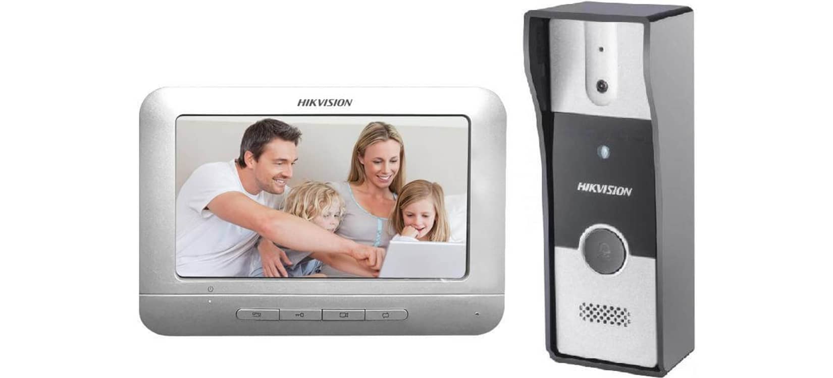 -Hệ thống chuông hình analog của Hikvision gồm màn hình và nút nhấn kết nối với nhau bằng dây cáp 4 sợi.