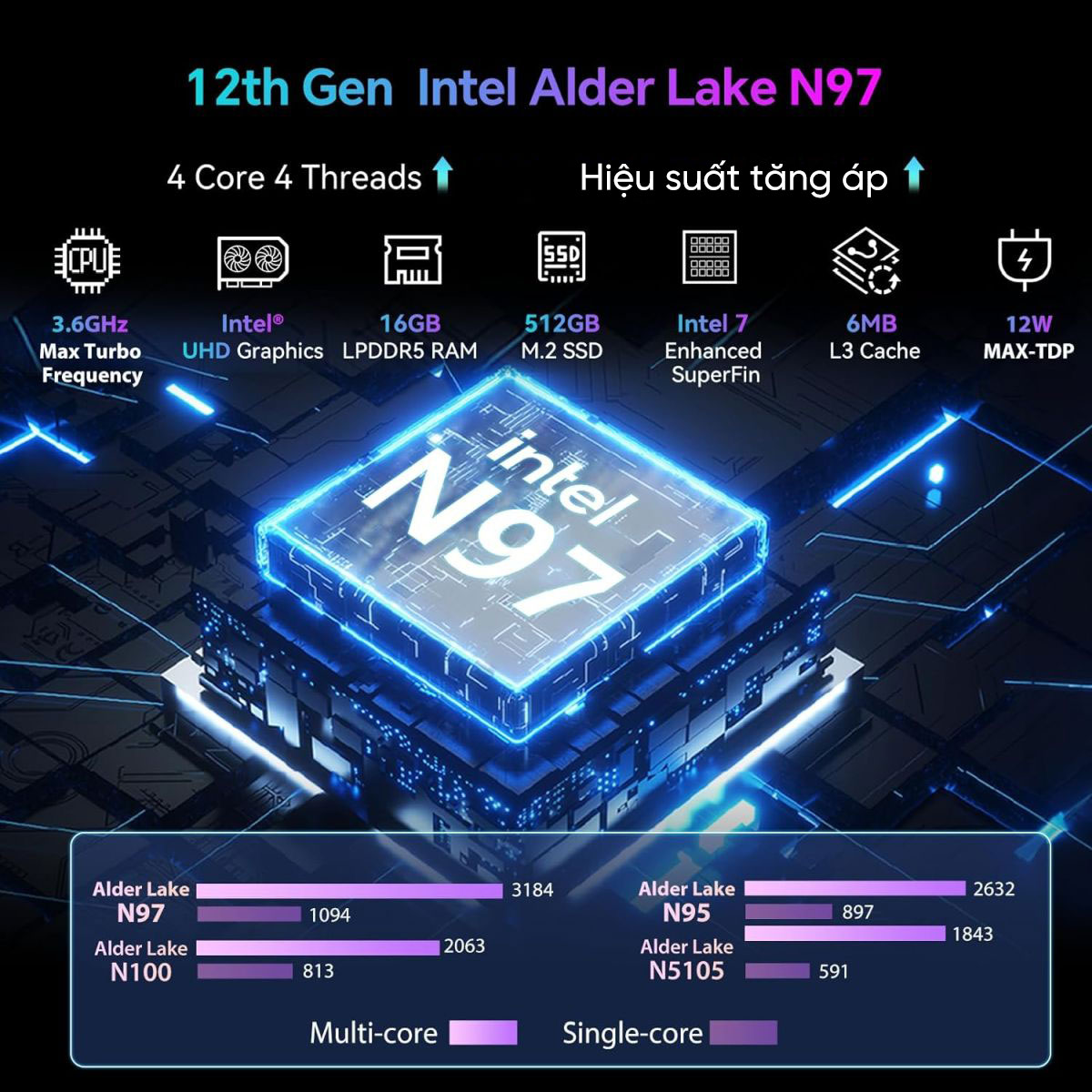 Phiên bản sử dụng Intel N97 có mức TDP chỉ 12W, thuộc nhóm vi xử lý tiết kiệm năng lượng trong phân khúc mini PC. Với 4 nhân xử lý, xung nhịp turbo tối đa 3.60GHz và 6MB Intel Smart Cache, máy đáp ứng tốt các nhu cầu: