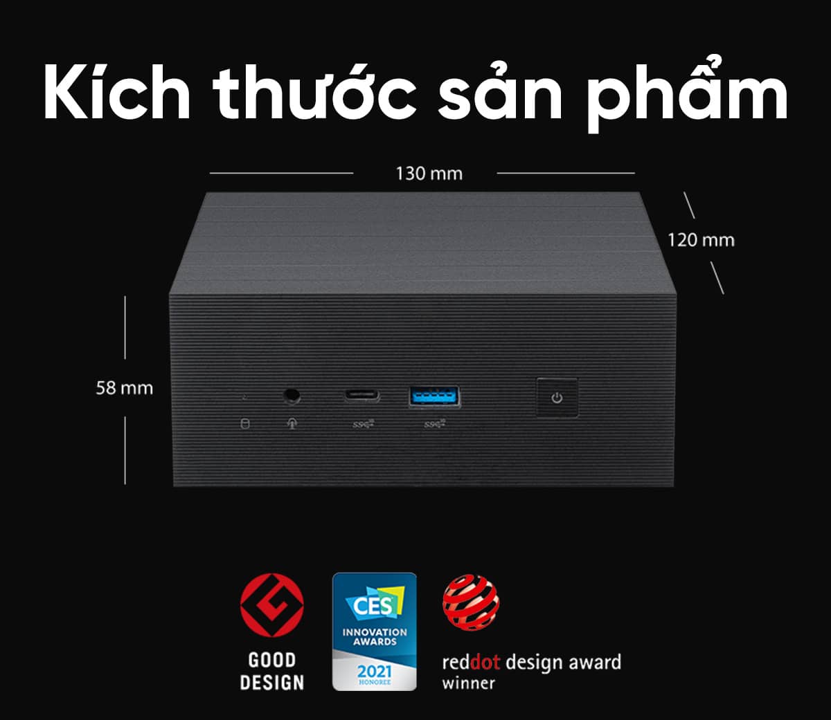 Asus PN63-S1-S5098MV sở hữu thiết kế nhỏ gọn với kích thước chỉ 120 x 130 x 58 mm và trọng lượng khoảng 900g, dễ dàng đặt trên bàn làm việc hoặc mang theo bên mình. Với tông màu tối giản, máy tính này sẽ là điểm nhấn tinh tế cho mọi không gian làm việc, từ văn phòng hiện đại đến góc làm việc tại nhà.
