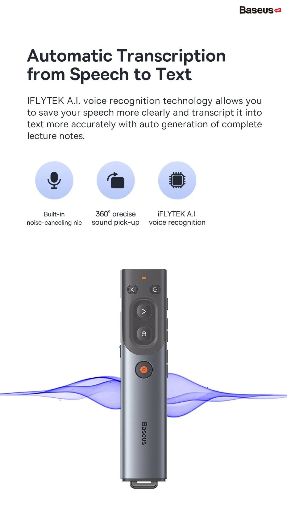 Công nghệ IFLYTEK A.I tự nhận diện gióng nói thành văn bản, cho phép bạn lưu bài phát biểu của mình rõ ràng hơn với tính năng tự động tạo các ghi chú bài thuyết trình hoàn chỉnh.