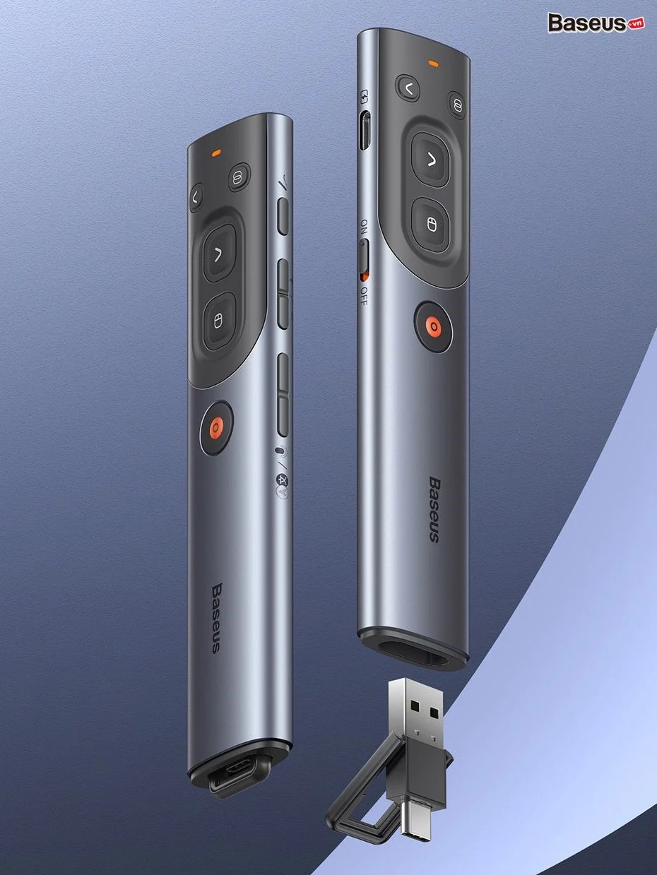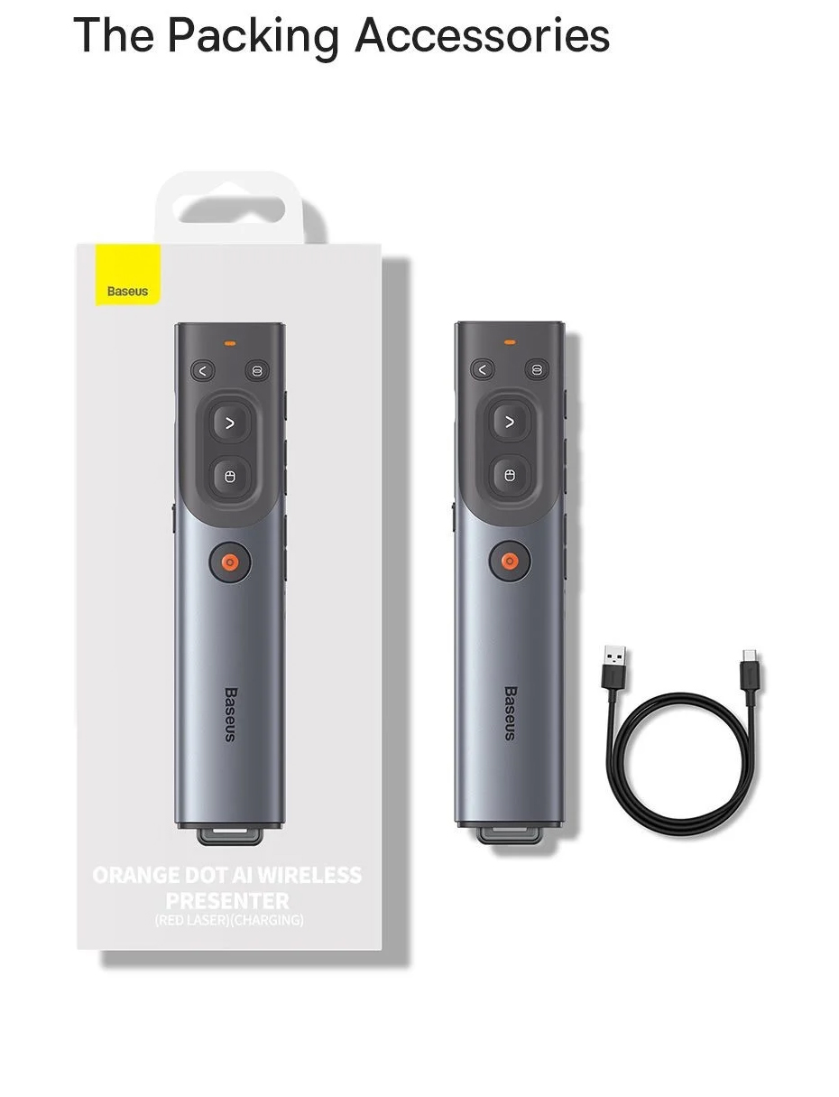 Bút trình chiếu Baseus Orange Dot AI là một trợ thủ đắc lực không thể thiếu dùng cho các buổi thuyết trình nhờ được trang bị nhiều tính năng tiện dụng, hưu ích và cần thiết như: bút laser (laser poiter), điều hướng slide cho Powerpoint (page up/down), nút mở liên kết, nút tạm dừng khi phát video, nút show/hide...