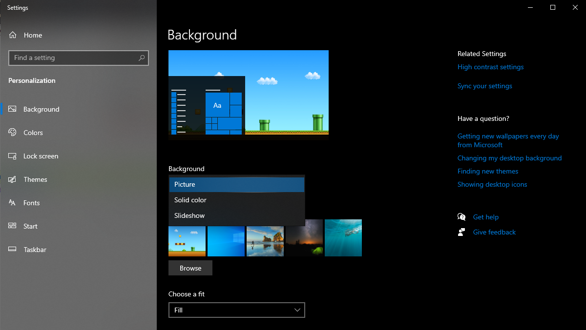 Bước 3: Nếu chọn dạng Picture, bạn cần cài đặt đường dẫn tới hình ảnh được chọn được lưu trữ trên máy tính bằng cách bấm vào nút Browse > Chọn hình ảnh sau đó nhấp vào Choose pciture để thay đổi hình nền cho máy tính, laptop.