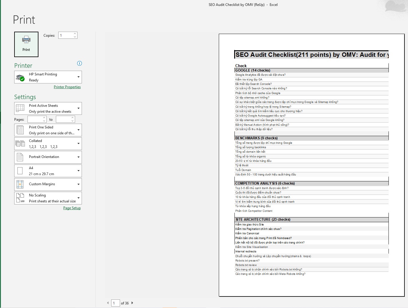 Cách 1 : Ấn kết hợp 2 phím Ctrl + P. Sau đó màn hình sẽ hiện một bảng settings như dưới đây, nếu không cần điều chỉnh gì nhiều bạn ấn luôn vào nút Print để thực hiện thao tác in.