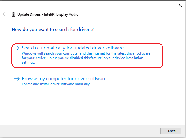 Bước 3: Lúc này, Window sẽ bước vào quá trình cập nhật Driver âm thanh. Ở đây sẽ có 2 lựa chọn, bạn chọn dòng đầu tiên Search automatically for updated driver software để tự động tải về driver từ trên mạng Internet.