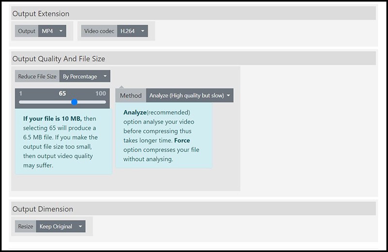 Video Smaller cũng là một lựa chọn tuyệt vời để nén dung lượng video. Với Video Smaller bạn có thể tải lên các tệp video có dung lượng lên đến 500 MB. Ngoài ra, bạn còn có thể tắt âm thanh trực tiếp trên video từ trang web này.