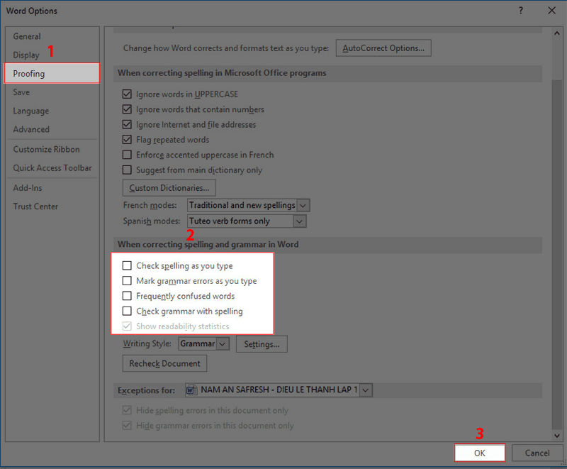 Bước 3: Trong mục tùy chọn Options, chọn Proofing, tại When correcting spelling and grammar in Word ( tính năng kiểm tra chính tả trong Word ) bỏ chọn các dấu tích ở các mục :