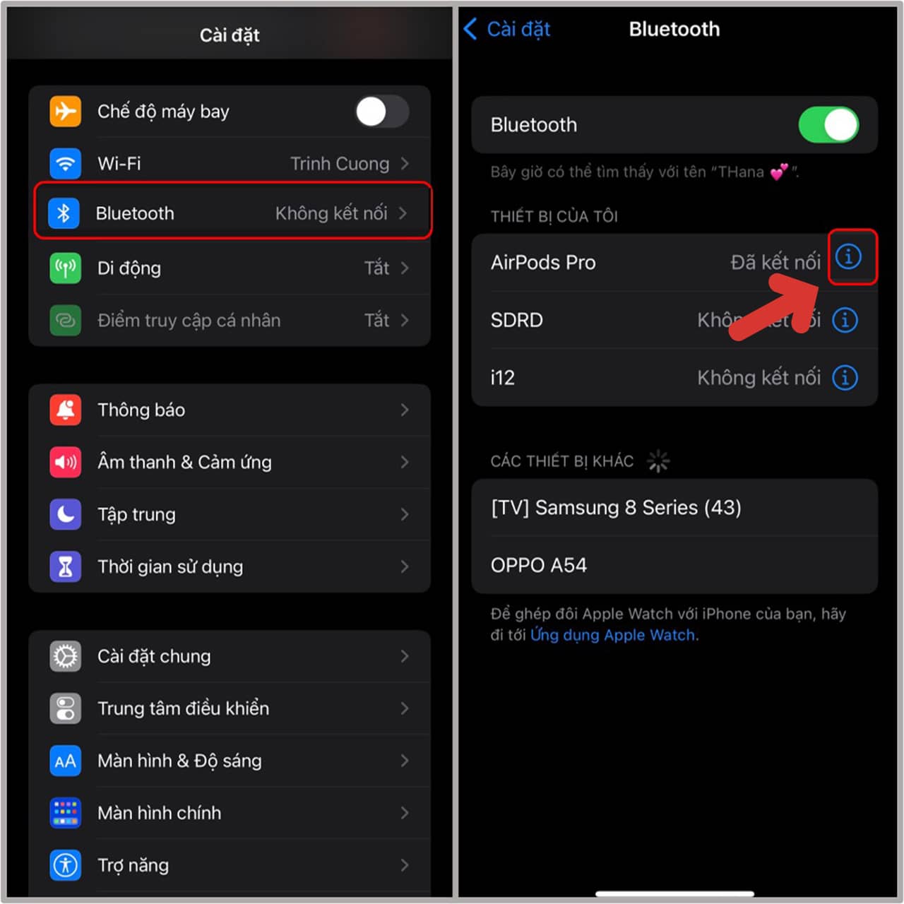 Bước 1: Truy cập vào Cài đặt ở iPhone > Nhấn chọn Bluetooth > Click chữ i bên cạnh tai nghe AirPods Pro.