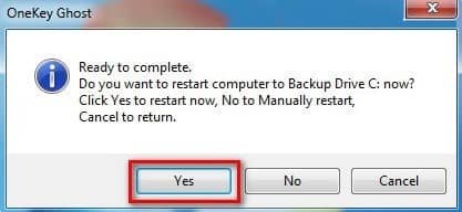 Sau khi chọn xong, phần mềm sẽ hiện một cửa sổ thông báo rằng bạn có muốn khởi động lại ổ đĩa C để tiến hành back up luôn hay không. Ấn Yes để thực hiện nay, No để reset lại sau và Cancel để hủy bỏ.