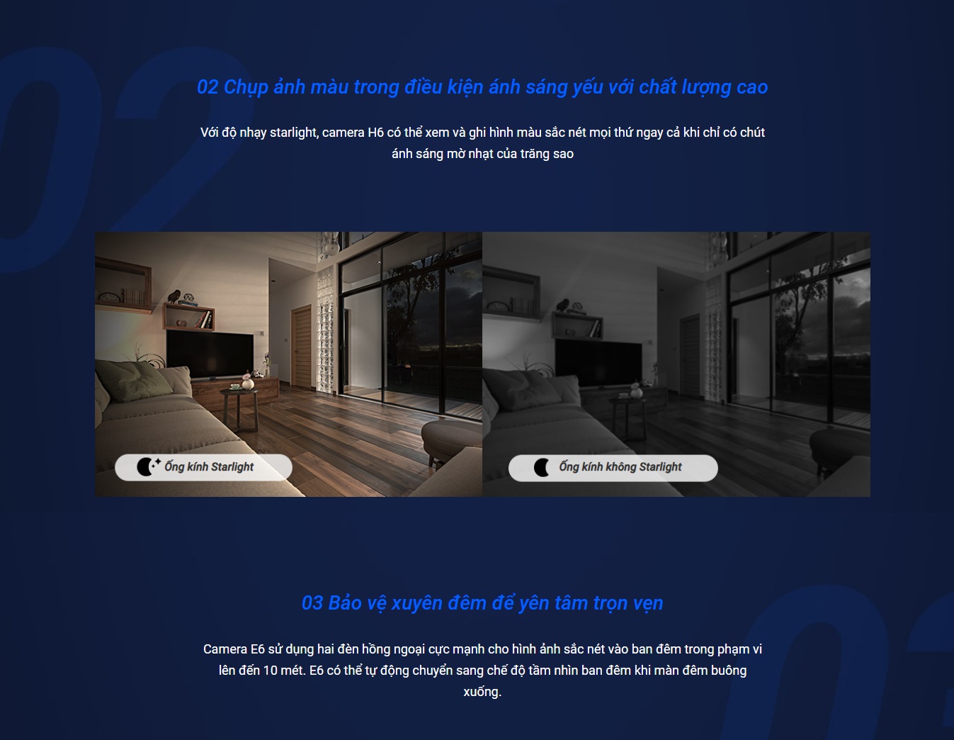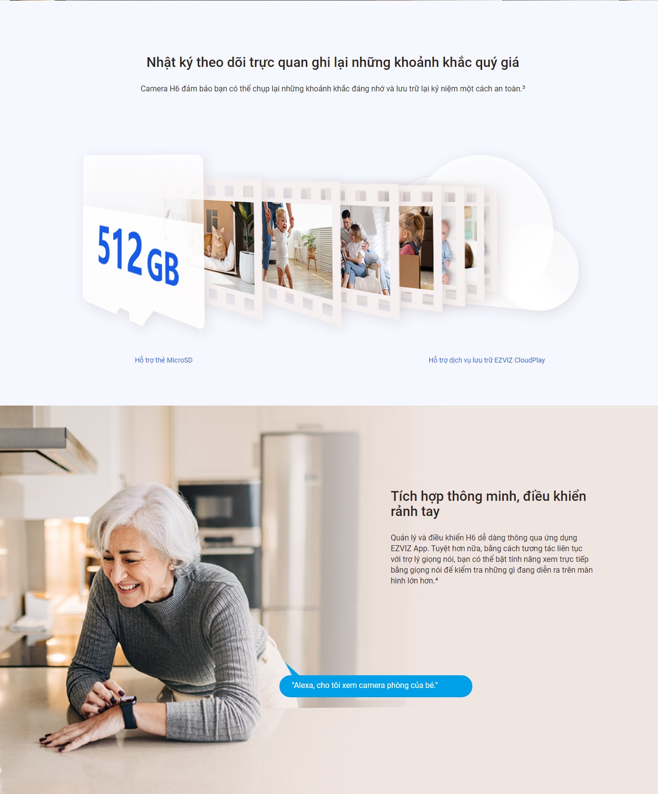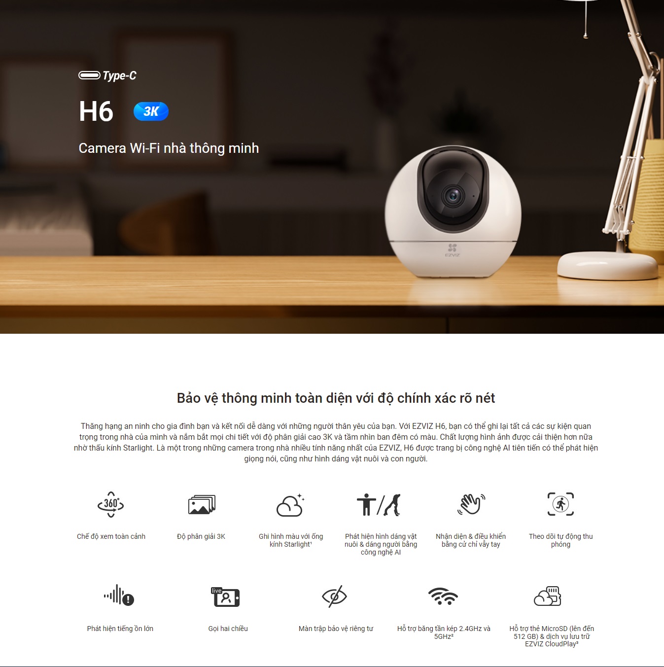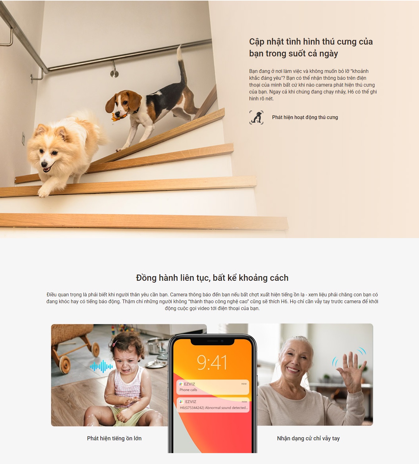 Camera EZVIZ CS-H6 có độ phân giải 5.0 Megapixel, cho ra hình ảnh 3K trên màn hình rất rõ ràng và sắc nét. Hình ảnh ban ngày hiển thị sắc nét kể cả khi ngược sáng vì sản phẩm có tính năng chống ngược sáng rất hiệu quả. Ban đêm đèn hồng ngoại sẽ giúp bạn quan sát căn phòng khoảng cách 10m mà không bị vỡ nét hay bị muỗi màn hình. Với gia đình có con nhỏ hoặc người già, EZVIZ CS-H6 có tính năng nhận diện cử chỉ. Khi con của bạn hay bố mẹ, ông bà của bạn có nhu cầu khẩn cấp chỉ cần vẫy tay trong khung hình của camera, máy sẽ tự phát tín hiệu cuộc gọi đến chiếc điện thoại đang theo dõi của bạn, gọi điện đàm thoại 2 chiều rất hiệu quả và nhanh chóng. Còn với các bạn nuôi thú cưng, Camera EZVIZ CS-H6 cũng có chế độ riêng dành cho bạn khi phát hiện thú cưng như chó, mèo đang di chuyển trong khung hình camera.