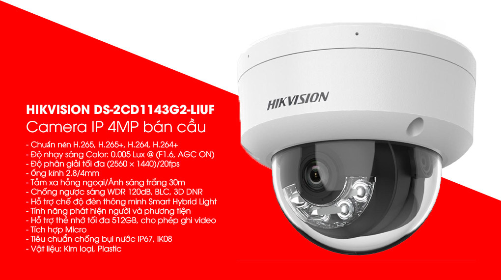 CAMERA HIKVISION DS-2CD1143G2-LIUF là dòng sản phẩm camera IP có độ phân giải 4.0 Megapixel cho hình ảnh chất lượng rõ ràng, chất lượng. Sản phẩm camera tích hợp chức năng phát hiện người và phương tiện cùng Chế độ đèn thông minh, với quan sát tầm hồng ngoại lên đến 30m quan sát những đối tượng lạ từ xa nhanh chóng.