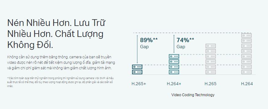 Với camera IP giám sát TP-Link VIGI C230I được trang bị chuẩn nén H.265+ giúp tiết kiệm được dung lượng của ổ đĩa, giảm tải được mạng mà không làm giảm được chất lượng hình ảnh.