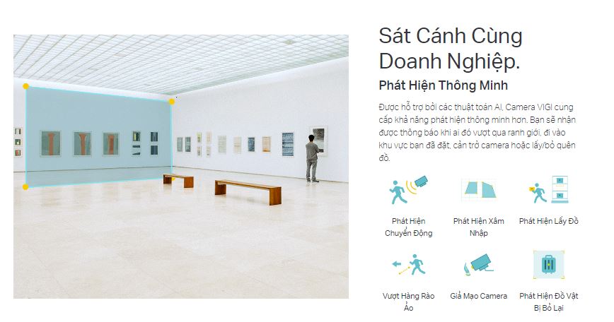 Camera dome quan sát TP-Link VIGI C230I được hỗ trợ các thuật toán AI cung cấp khả năng phát hiện thông minh hơn. Camera TP-Link VIGI C230I có thể phát hiện được các chuyển động, phát hiện đối tượng bị bỏ rơi hoặc phát hiện xâm nhập.