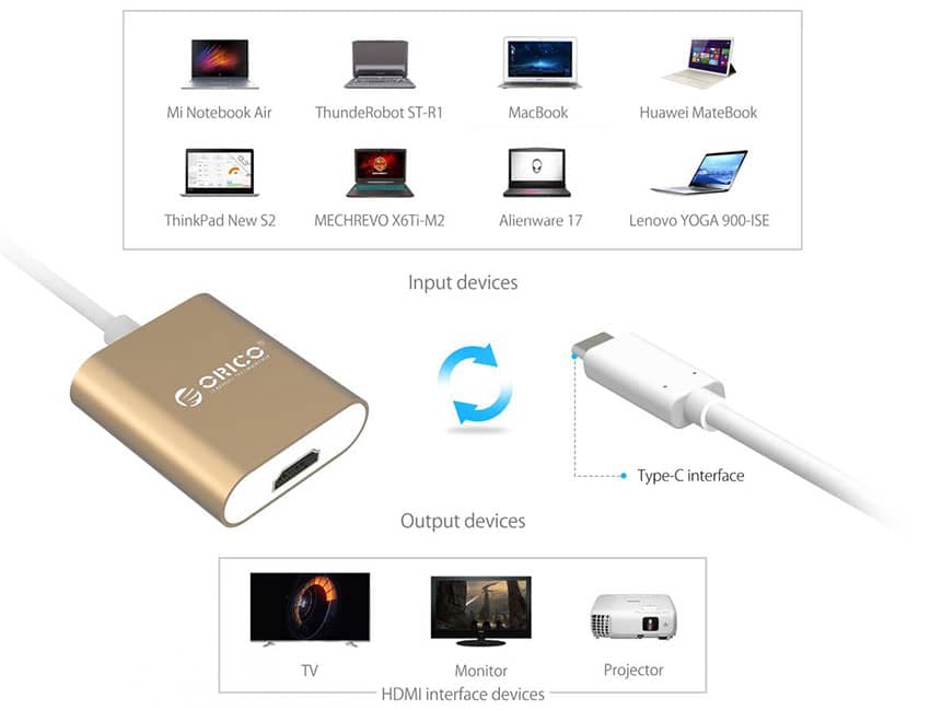 Đầu Chuyển Đổi Type C Sang HDMI Orico RCH-GD cho phép bạn chuyển dữ liệu từ màn hình Macbook của mình với TV thông qua cổng HDMI hoặc hiển thị trên HDTV 1080p hoặc các thiết bị hiển thị khác.