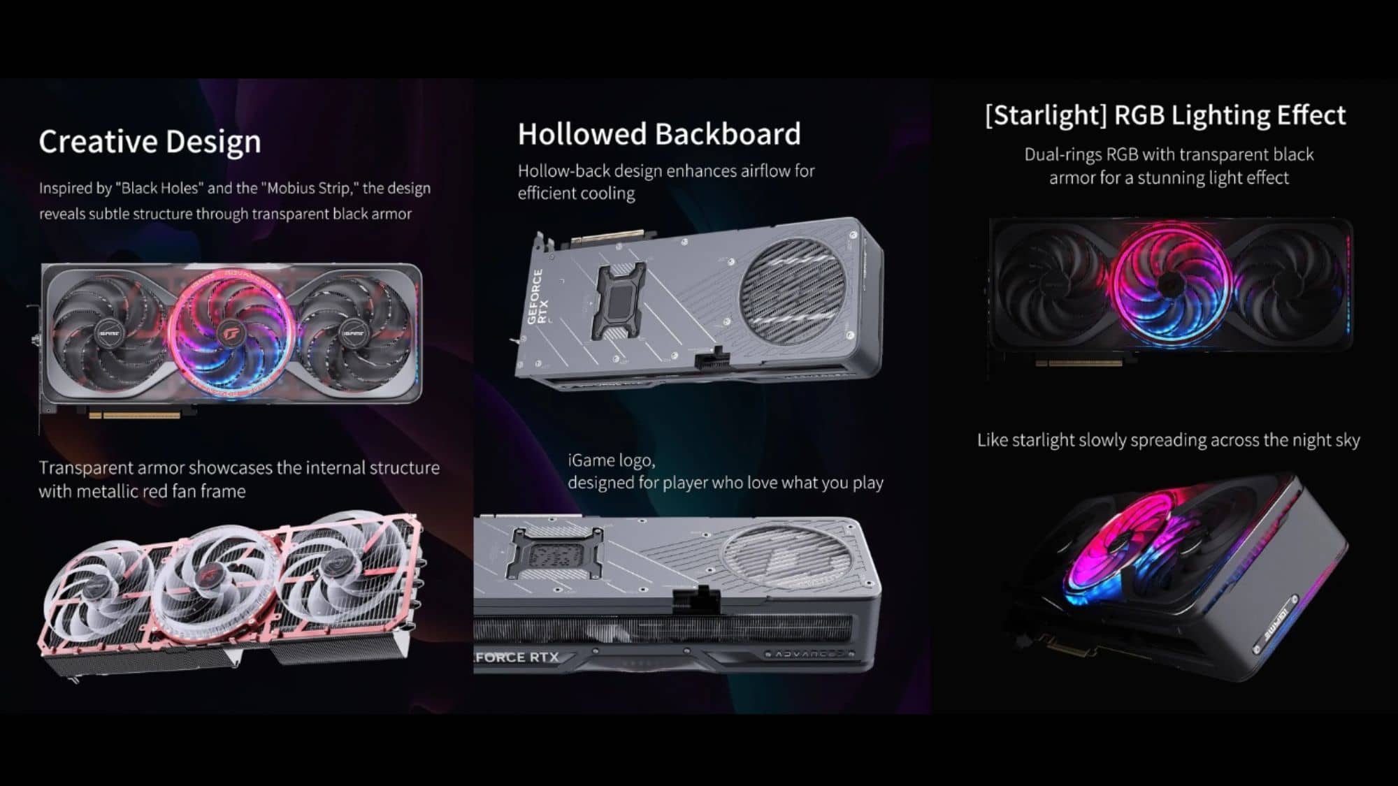 Card sở hữu thiết kế trong suốt màu đen, tạo nên vẻ ngoài sang trọng và hiện đại, khung quạt mới hiển thị rõ cấu trúc bên trong độc đáo, thể hiện sự tinh tế trong từng chi tiết. Điểm nhấn thẩm mỹ là hệ thống LED RGB Starlight ấn tượng, cho phép tùy chỉnh hiệu ứng ánh sáng, tạo nên phong cách cá nhân độc đáo cho dàn PC của bạn, thu hút mọi ánh nhìn.