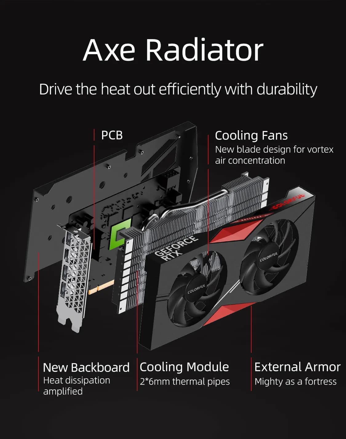 Ngoài mạnh mẽ về hiệu năng, Card màn hình Colorful GeForce RTX 4060 NB DUO 8GB-V / V5-V còn được chăm chút tỉ mỉ về thiết kế, tính thẩm mỹ và khả năng tản nhiệt tối ưu. Card được trang bị hệ thống tản nhiệt với các ống dẫn nhiệt bằng đồng và các lá tản nhiệt bằng nhôm truyền nhiệt nhanh chóng và hiệu quả từ GPU và các linh kiện quan trọng khác.