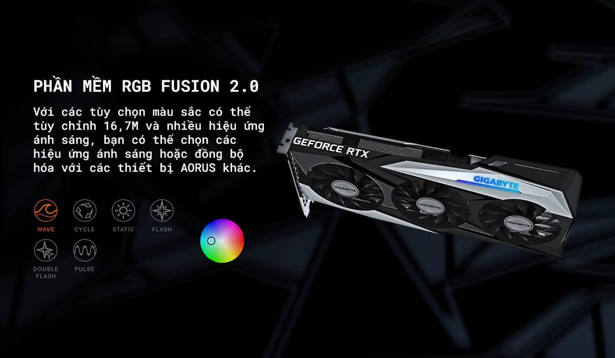 Phần mềm RGB Fusion 2.0 sẽ giúp Gigabyte RTX 3070 GAMING OC tỏa sáng theo đúng nghĩa đen. Đây là một hệ sinh thái ánh sáng đầy nghệ thuật với khả năng hiển thị lên đến 16.7 triệu màu cùng hàng loạt hiệu ứng chuyển động đa dạng được tích hợp sẵn. Thông qua giao diện điều khiển trực quan của phần mềm, bạn có thể biến không gian chiến game của mình trở nên huyền ảo hơn bao giờ hết: từ chế độ Static tĩnh lặng với tone màu xanh dịu mắt cho những đêm làm việc tập trung, đến chế độ Color Cycle hay Flash rực rỡ như một bữa tiệc ánh sáng mỗi khi lâm trận.