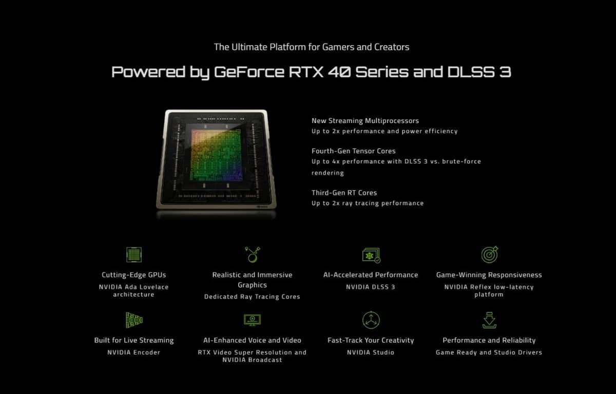 - Hiệu năng cao cùng NVIDIA DLSS 3: DLSS 3 sử dụng trí tuệ nhân tạo (AI) để tạo ra các khung hình bổ sung, giúp tăng tốc độ khung hình (FPS) trong game lên đáng kể, cho phép bạn chơi các tựa game AAA mới nhất ở độ phân giải cao và cài đặt đồ họa tối đa mà vẫn đảm bảo độ mượt mà. DLSS 3 không những cải thiện hiệu năng mà còn nâng cao chất lượng hình ảnh, mang đến trải nghiệm gaming tuyệt vời hơn bao giờ hết.