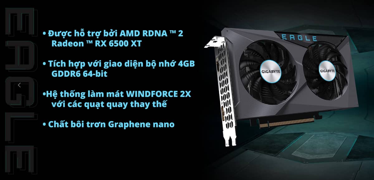 Card màn hình Gigabyte RX 6500 XT EAGLE-4GD - Card màn hình thuộc dòng EAGLE của Gigabyte mang trên mình sức mạnh từ kiến trúc RDNA™ 2 hiện đại của AMD mà còn sở hữu thiết kế bền bỉ, tối giản nhưng cực kỳ phong cách. Đây chính là mảnh ghép hoàn hảo cho những bộ PC chuyên dụng để leo rank Esport hay khám phá những thế giới mở ở độ phân giải Full HD.