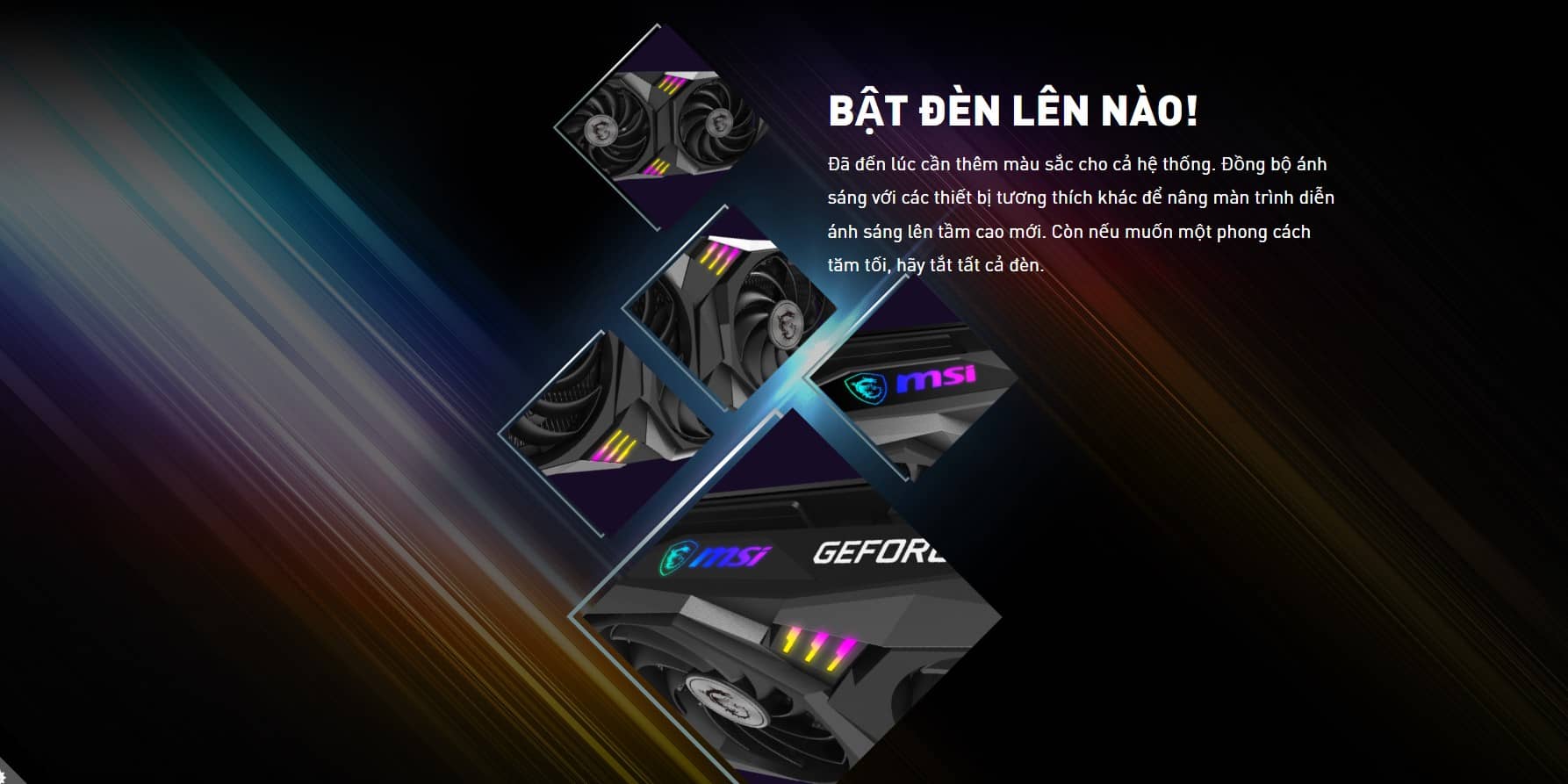 - Thiết kế đối xứng đặc trưng: Các dải đèn LED được bố trí dọc theo các đường cắt chéo trên mặt nạ quạt, tạo nên vẻ ngoài mạnh mẽ như những vết cào của loài rồng – biểu tượng quyền lực của MSI. Khi lên đèn, chiếc card trông như một khối động cơ đang tràn đầy năng lượng.
