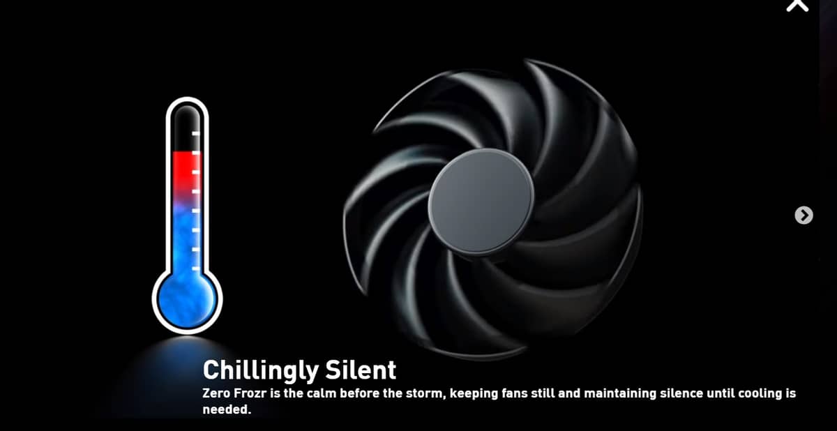 - Công nghệ Zero Frozr: Khi bạn chỉ lướt web, xem phim hoặc làm các công việc văn phòng, quạt sẽ ngừng quay hoàn toàn. Chiếc card sẽ hoạt động ở chế độ im lặng tuyệt đối, chỉ "thức giấc" khi bạn bắt đầu bước vào những trận chiến căng thẳng.