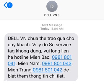 Trường hợp hóa đơn không hợp lệ (không đúng số service tag) khách hàng sẽ nhận được tin nhắn như sau: