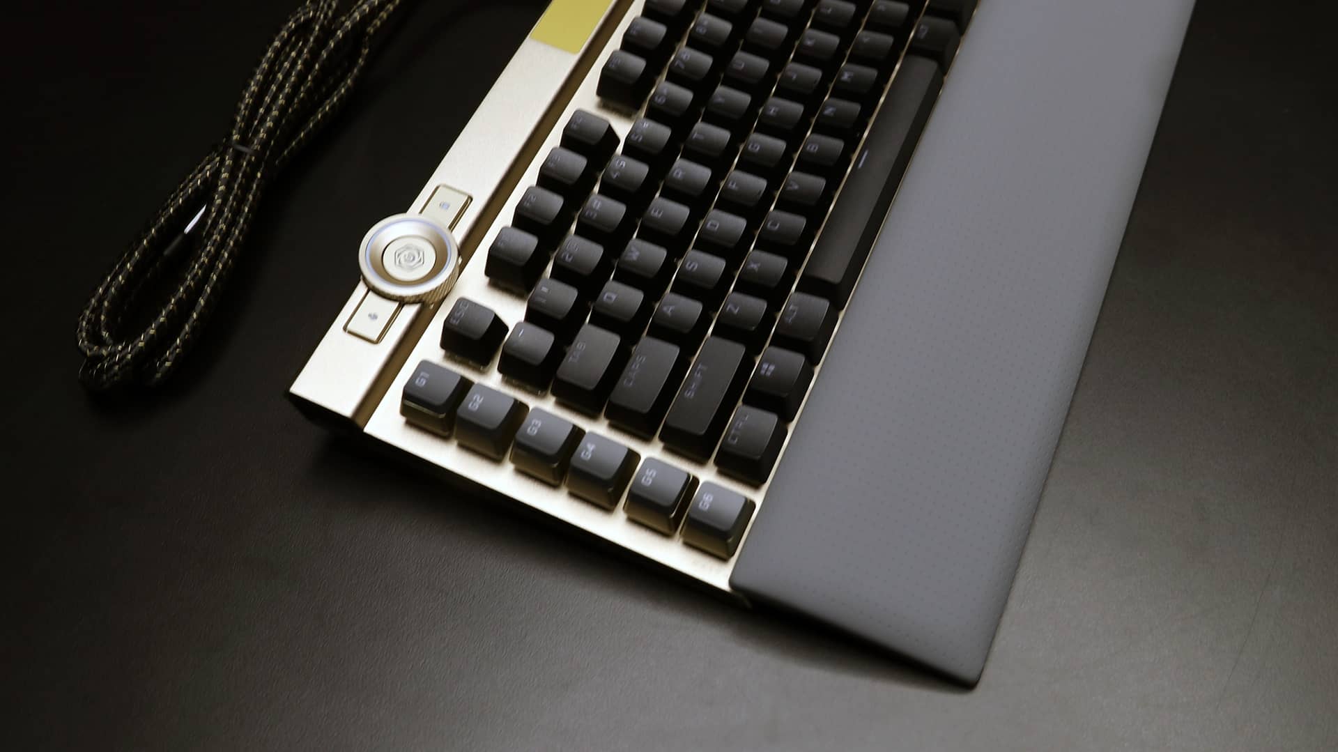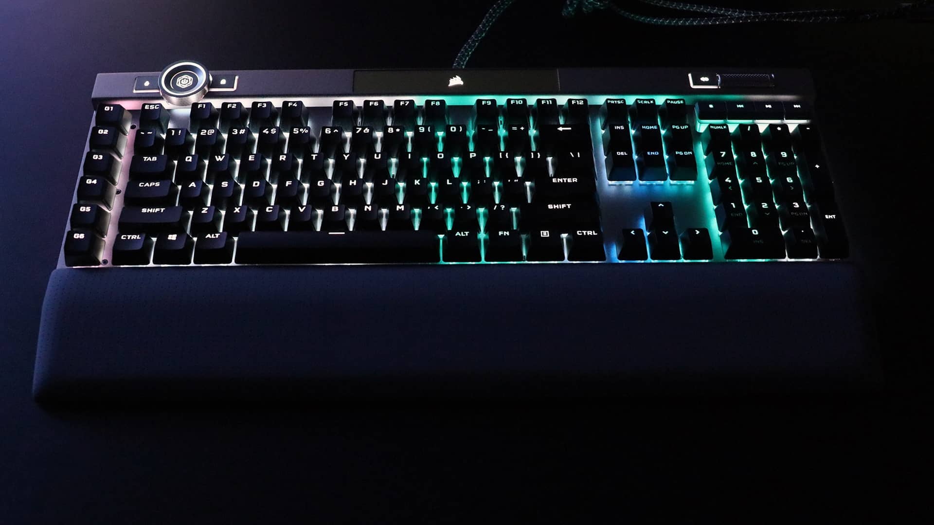 Trên cùng bên trái của Corsair K100 là một núm xoay có thể được sử dụng cho 8 tính năng khác nhau, từ qua bài và thay đổi ứng dụng cho đến trượt trang web và thay đổi độ sáng đèn LED RGB. Chính giữa của núm xoay là một nút bấm thông thường, và các nút bấm ở 2 bên cho phép game thủ thay đổi giữa các bộ thiết lập khác nhau cũng như kích hoạt chế độ Game.