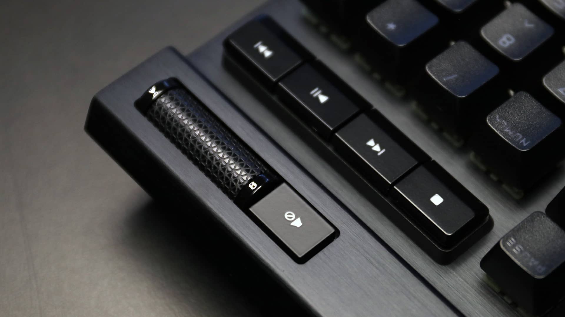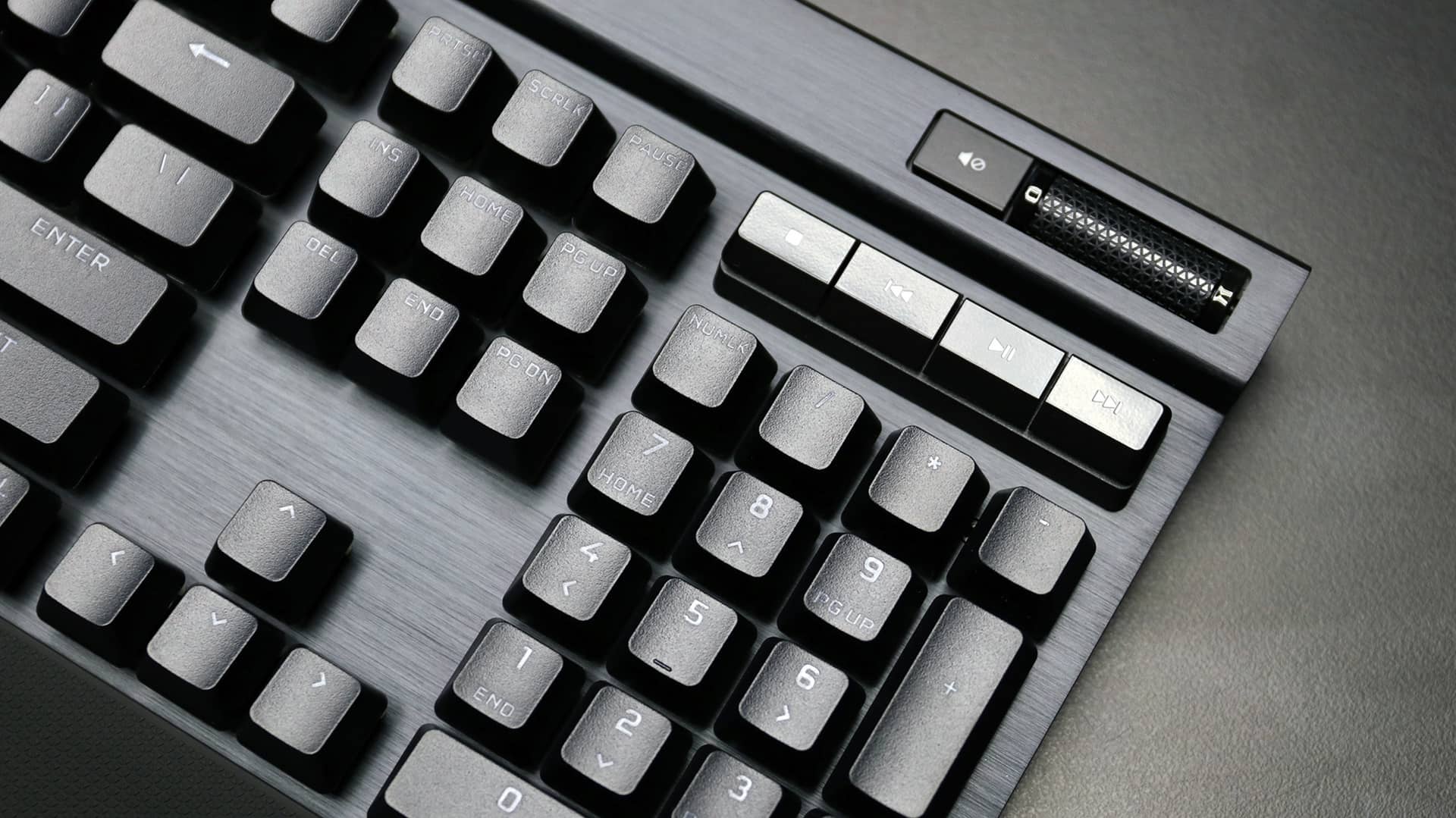 Nắp phím của bàn phím cơ Corsair K70 RGB Pro cũng rất tốt, không giống như những sản phẩm PBT 2 lớp thông thường khác, hay hi sinh độ dày để cho ánh sáng đèn RGB qua nhiều hơn. Những nắp phím của K70 RGB Pro vẫn là 2 lớp nhưng cho phép đèn RGB tỏa sáng. Tuy nhiên, phông chữ có thể sẽ không hợp ý với đại đa số game thủ. Thảm nghỉ tay có thể được tháo lắp dễ dàng nhờ vào thỏi nam châm.