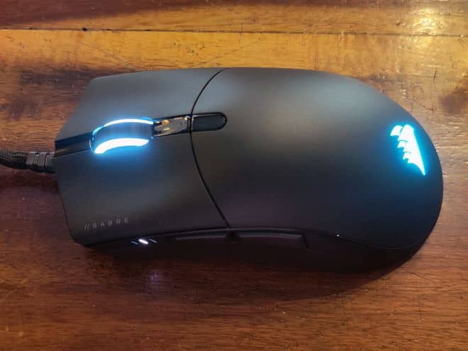 Corsair Sabre RGB Pro không có thiết kế đối xứng, hướng đến những người dùng thuận tay phải. Chuột có trọng lượng rất nhẹ, chỉ 74g, ở trong một thân hình tương đối lớn. Nhìn chung, khi cầm, Sabre RGB Pro vừa vặn cho cả bàn tay nhỏ và lớn.