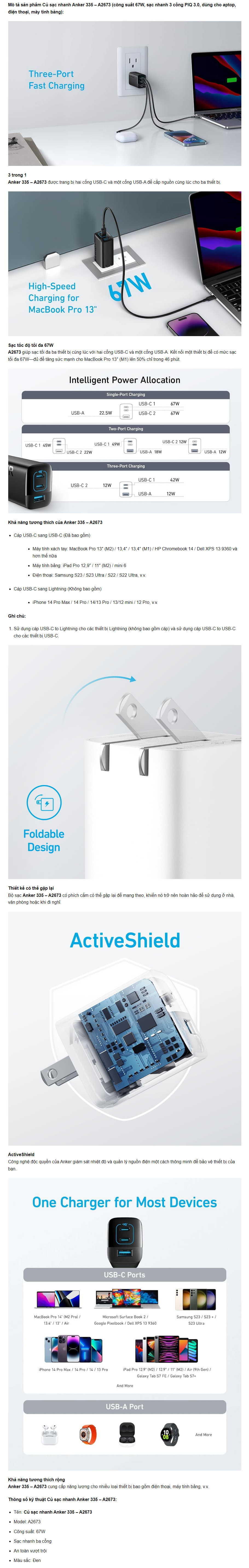 Củ sạc nhanh Anker 335 67W A2673 - 02 cổng Type C + 01 cổng Type A - Màu đen