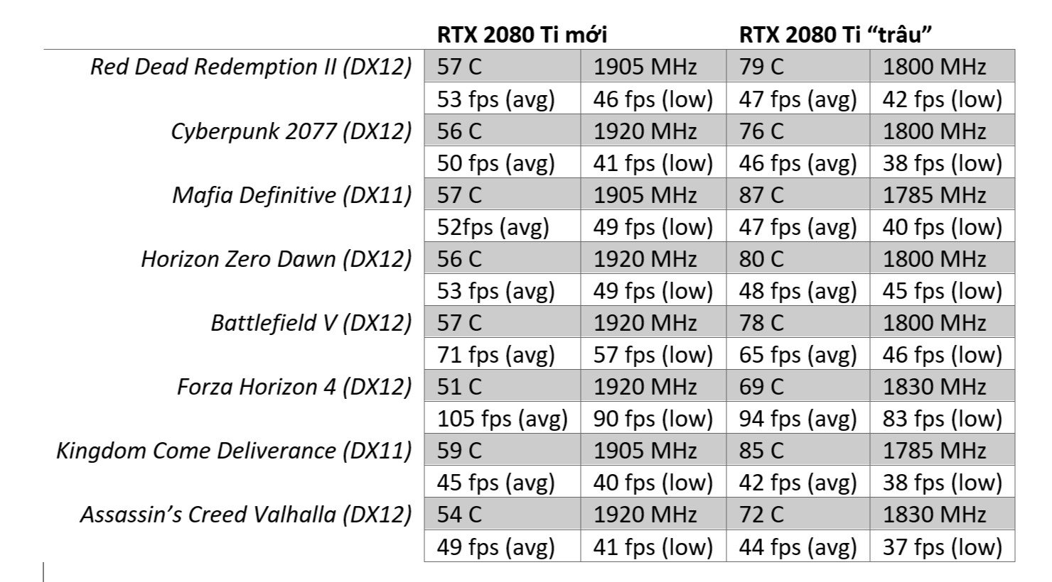 Chiếc card RTX 2080 Ti "trâu" giảm trung bình 10% hiệu năng so với card mới, thậm chí đến 20% ở tựa game Forza Horizon 4. Dù vậy, hiệu năng của chiếc card "trâu" này có thể được cải thiện nếu chúng ta tháo ra bào trì, trét keo tản nhiệt mới, thay thermalpad cho dàn VRM và VRAM, vệ sinh heatsink và quạt. Đây là điều cần làm đối với card đồ họa sử dụng thông thường chứ chưa nói đến card "trâu".