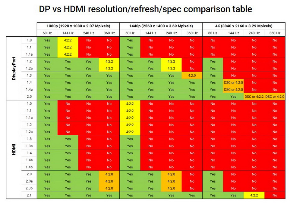 Tuy nhiên game thủ bình thường muốn chơi game ở tần số quét cao chỉ cần chú ý vào cột 1440p 144Hz và có thể là 4k 60Hz. Bạn có thể dễ dàng nhận ra rằng DisplayPort hỗ trợ các độ phân giải và tần số quét cao tốt hơn nhiều so với HDMI.