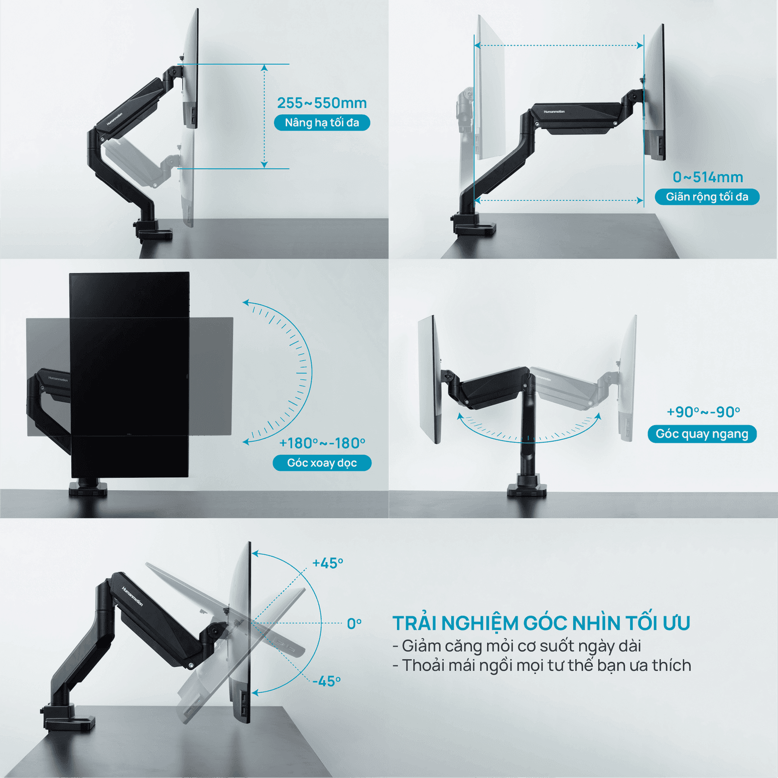 Thiết kế giá đỡ human motion T9 theo chuẩn công thái học ergonomics, giúp tối ưu tư thế nhìn màn hình khi làm việc. Giá đỡ có cả kẹp và khoan linh hoạt cho bạn lựa chọn, có hướng dẫn đi kèm arm. Nếu kẹp arm vào bàn, độ dày bàn lý tưởng: 1cm - 7,5cm. Nếu khoan vào bàn, độ dày bàn lý tưởng: 1cm - 4,5cm