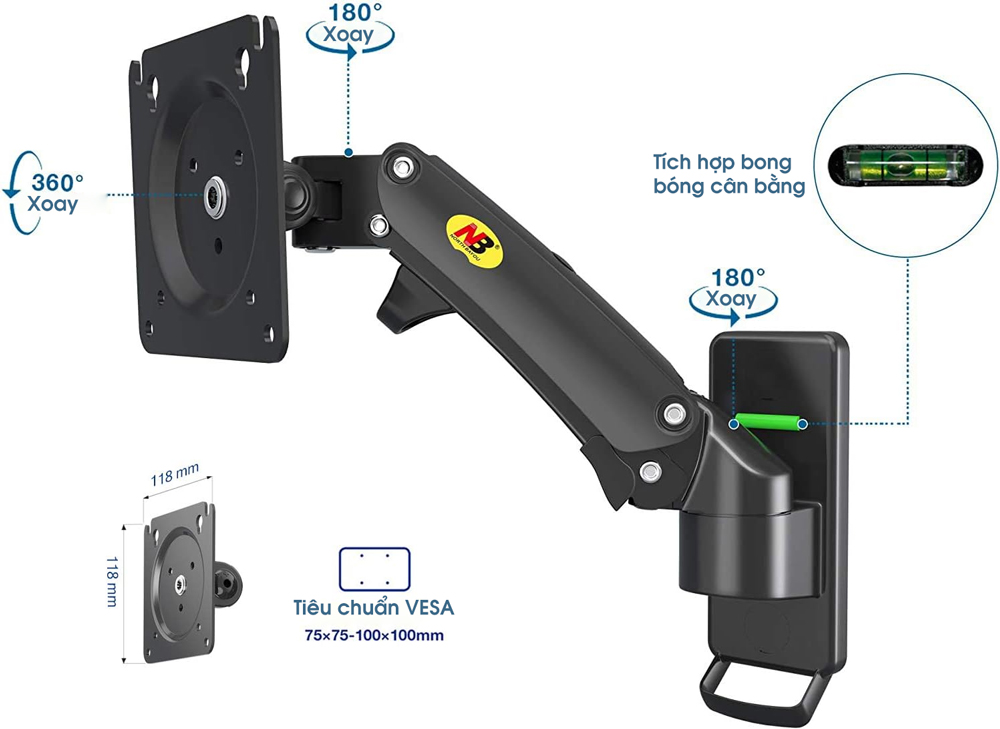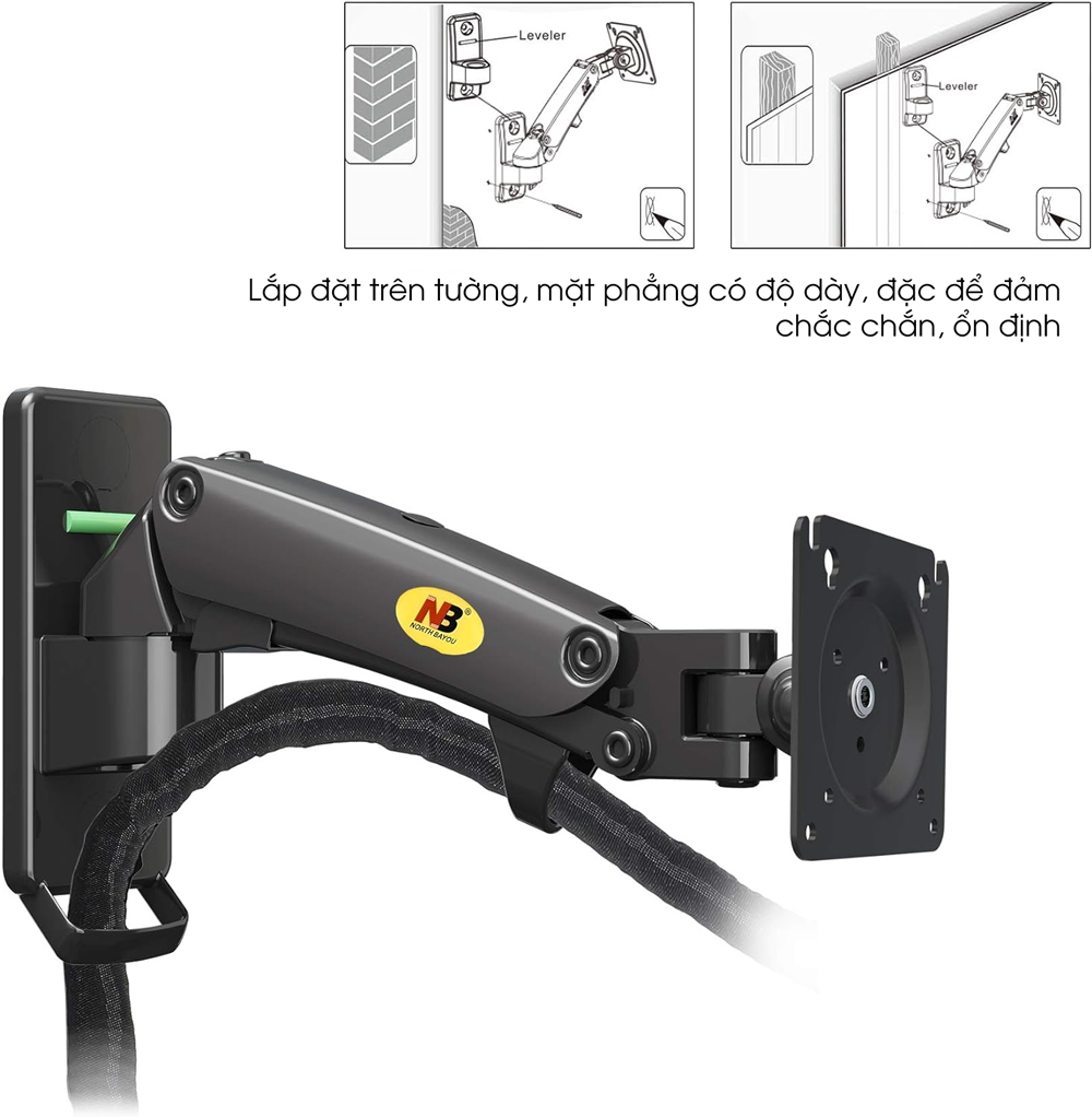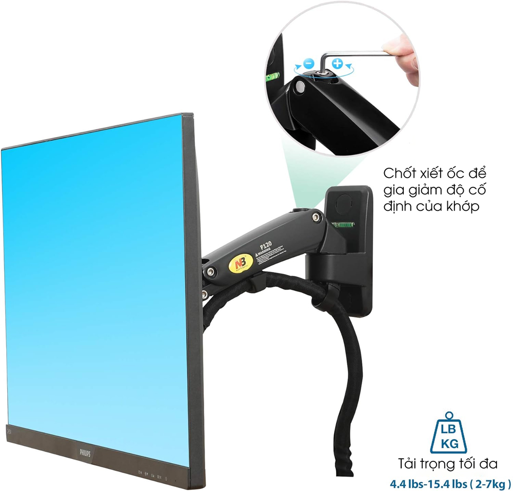 Sản phẩm có khả năng chịu tải từ 2-7kg. Cánh tay đơn này được gắn vào tường, ổn định hơn giá đỡ màn hình để bàn.