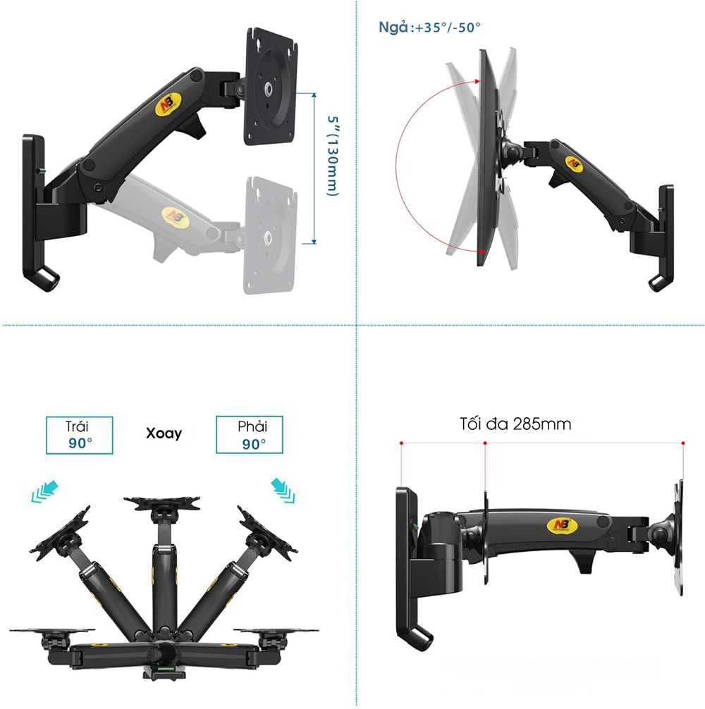 Điều chỉnh độ nghiêng màn hình từ +35 đến -50 độ, xoay +90 đến -90 độ, xoay màn hình 360 độ, hỗ trợ bạn góc nhìn tối ưu hơn và giúp giảm căng thẳng cho mắt, lưng và cổ.Khoảng cách thẳng đứng 5″(130mm); Màn hình có thể kéo dài tối đa 11,2″(285mm) từ tường và gập vào tường 3,35″(85mm), Tiết kiệm không gian bàn làm việc quý giá của bạn trong cuộc sống hàng ngày.