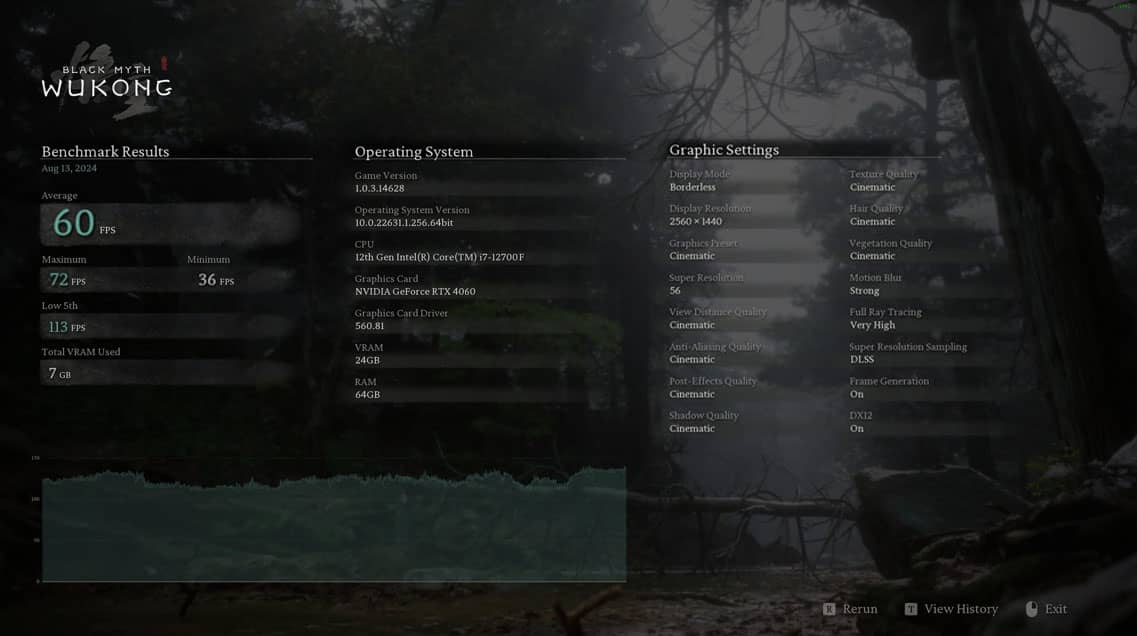 Dựa trên ứng dụng test benchmark của game Black Myth Wukong ở độ phân giải 2K 1440p/ DLSS/ Cinematic Setting/ Super Resolution 56/ Ray Tracing Very High với RTX 4060