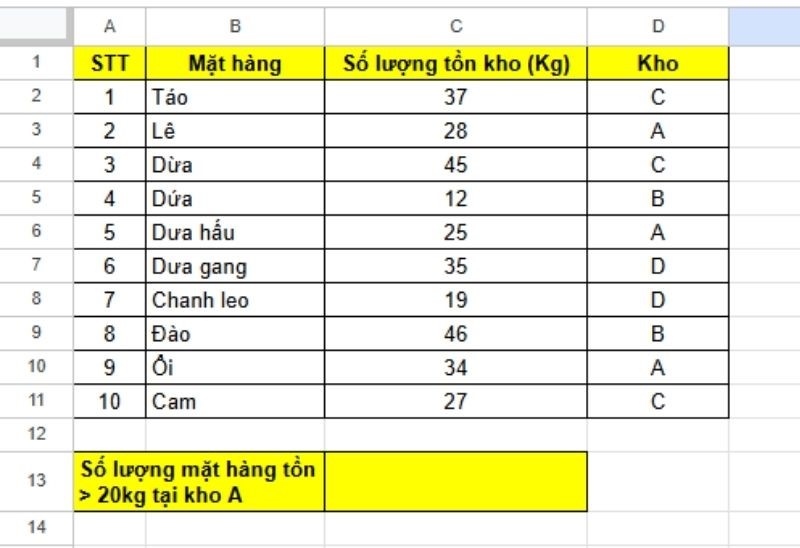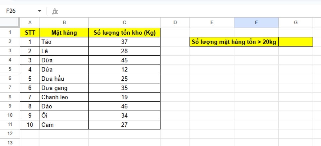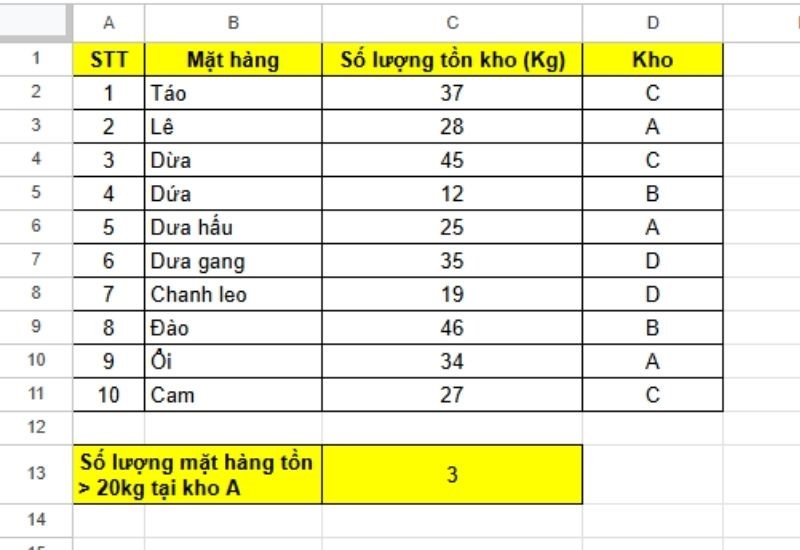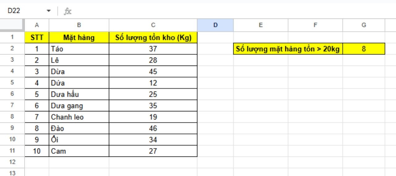 Để kiểm tra xem có bao nhiêu mặt hàng đang tồn kho lớn hơn 20Kg chúng ta có công thức sau: =COUNTIF(C2:C11;">20").