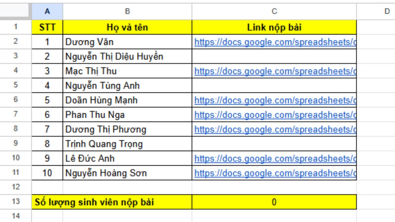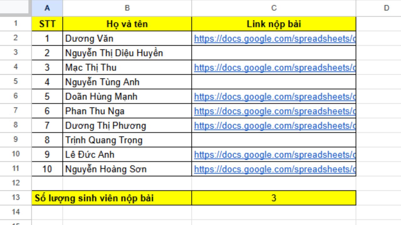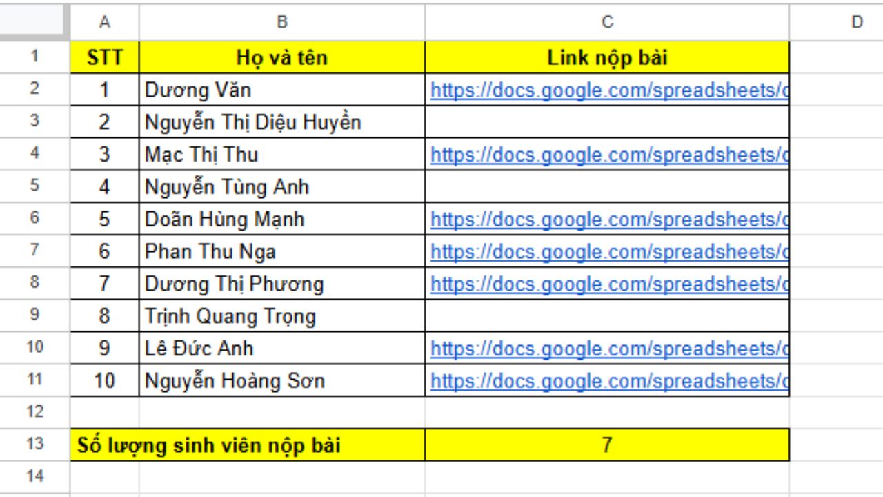 Và để thống kê sinh viên chưa nộp bài, chúng ta sẽ có công thức sau: =COUNTBLANK(C2:C11).