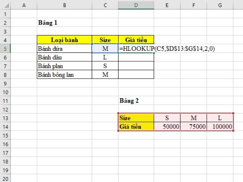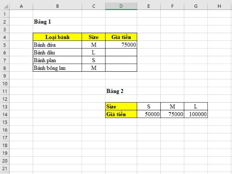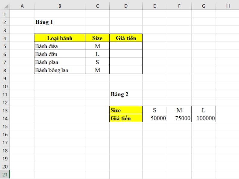 Ở ví dụ dưới đây, chúng ta cần xác định giá tiền bánh theo size từ bảng order (bảng 1) và bảng giá tiền (bảng 2).